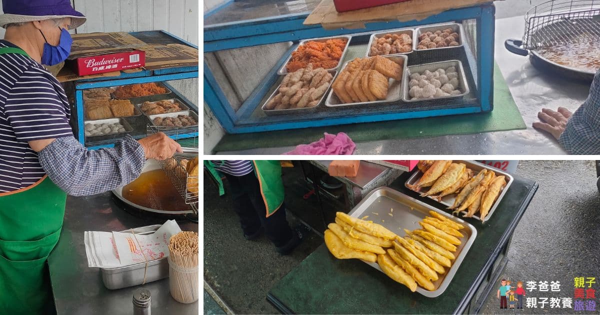 林投公園炸魚餐點的類型不多,基本款的像是炸蘿蔔絲、甜不辣、米糕、地瓜餅、炸鮮魚與花枝丸。